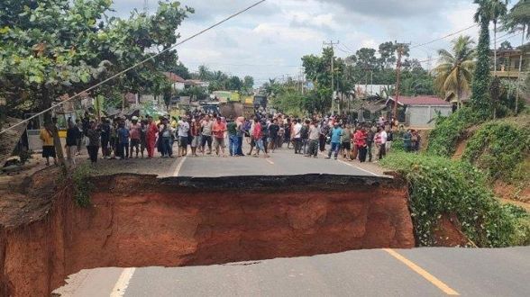 BNEWS - Jalan utama yang menghubungkan Provinsi Sumatera Barat (Sumbar) dan Provinsi Jambi putus total setelah dihantam banjir, Minggu (2/3/2025), di kawasan Dusun Sirih Sekapur, Kecamatan Jujuhan, Kabupaten Bungo, atau sekitar dua kilometer dari Sungai Rumbai, Dharmasraya.