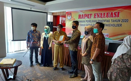 TANAH DATAR - Komisi Pemilihan Umum (KPU) Kabupaten Tanah Datar melaksanakan Evaluasi Pemilihan Kepala Daerah (Pilkada) tahun 2020, sekaligus peyerahan plakat penghargaan atas dukungan Pemkab Tanah Datar selama proses Pilkada 9 Desember 2020 lalu.