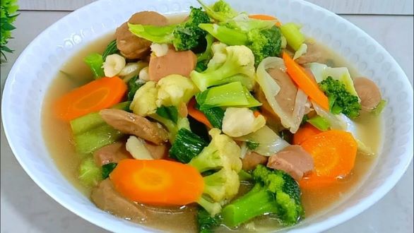 Bahan: Bawang merah 3 buah Bawang putih 2 siung Sawi putih Brokoli Wortel Jamur kancing Bakso ikan/ayam Telur Daun bawang Minyak goreng Saus tiram Garam Penyedap rasa