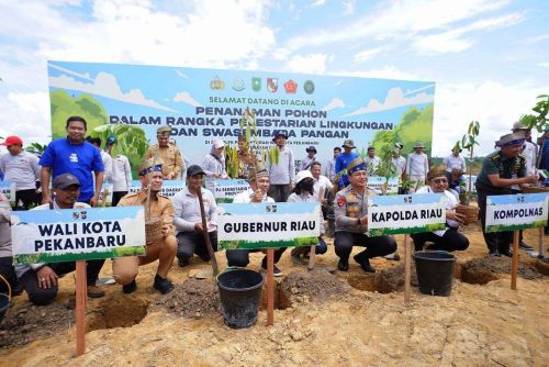 PEKANBARU - Pemerintah Provinsi (Pemprov) Riau bersama Pemerintah Kota (Pemko) Pekanbaru dan Polda Riau menanam 15 ribu bibit pohon di Komplek Perkantoran Tenayan Raya, Pekanbaru, Senin (21/4/2025).