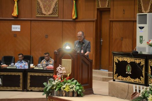 PEKANBARU - Pj Sekdaprov Riau, Taufiq OH, menyampaikan jawaban Gubernur Riau atas pandangan umum fraksi DPRD Provinsi Riau terhadap Ranperda Pemajuan Kebudayaan Melayu Riau, dalam rapat paripurna DPRD yang digelar di Pekanbaru, Senin (21/4/2025).