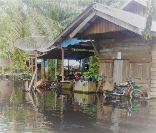 Rumah salah satu warga di Kelurahan Batu Panjang, Pulau Rupat, Bengkalis, saat luapan air akibat pembukaan kanal PT SRL. Kondisi air menggenang ini bisa bertahan hingga 2-3 bulan lamanya. (dok: warga/BNEWS)