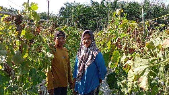 Sri dan suaminya di kebun yang mereka sewa untuk bercocok tanam. Keduanya mengalami trauma karena pernah dituduh membakar hutan dan turut menjadi korban tiap luapan air kanal PT SRL merendam Kampung Sidomulyo, Kelurahan Batu Panjang, Pulau Rupat, Bengkalis (dok:Rinai/BNEWS)