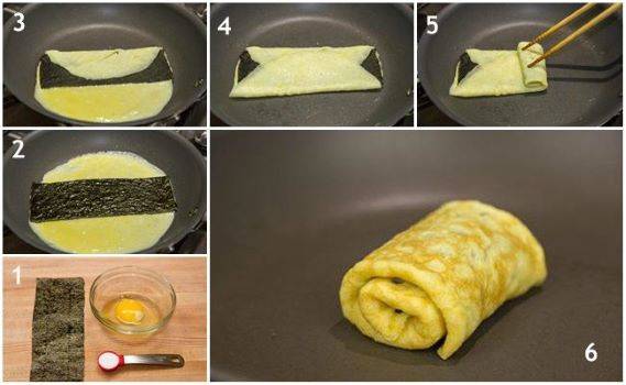 Cara membuat: 1. Campur telur, garam, penyedap, lada bubuk dan minyak wijen 2. Gulung nasi panas menggunakan nori 3. Dadar telur menggunakan teflon, setengah matang letakkan gulungan nasi dan Nori diatas telur. Gulung perlahan pakai sendok kayu 4. Jika sudah matang dan rapi tergulung pindahkan ke talenan 5. Potong telur dadar, kemudian pindahkan ke piring saji. Siram dengan sambal atau salad dreshing dan siap disantao.**/xie