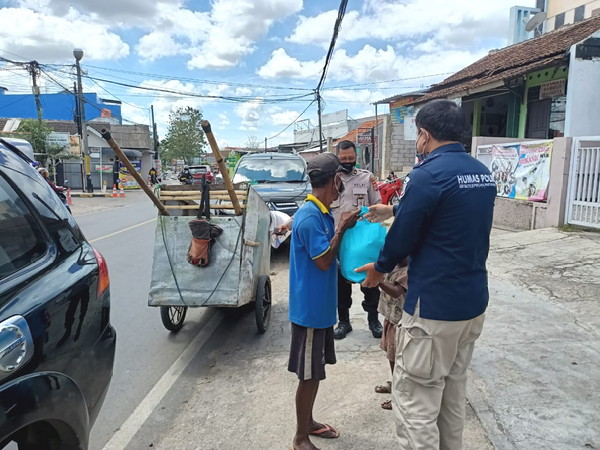 SERANG - Tim Warung Jumat Polda Banten kembali salurkan paket sembako, masker, hand sanitizer untuk pengemis, pemulung, tukang becak, tukang ojek dan masyarakat kurang mampu di sepanjang jalan Kota Serang, Jum’at (26/03/2021).