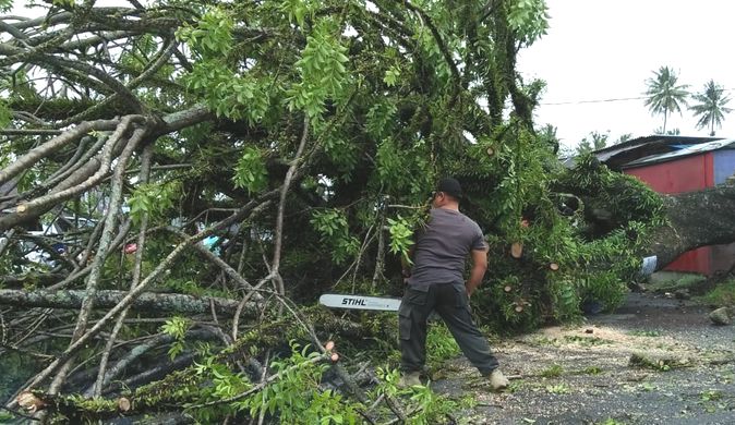 Ada satu pohon mangga tumbang dan menimpa rumah warga yang menyebabkan kerusakan. Selain itu pohon tumbang juga ada yang menghambat akses jalan dan aliran sungai.