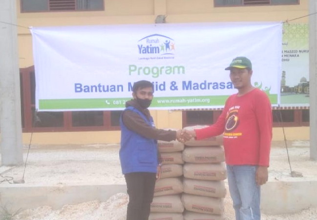 "Alhamdulillah bisa kami sampaikan bantuan untuk membantu proses pembangunan masjid. Bantuannya berupa 12 sak semen", kata Rizky, relawan Rumah Yatim.