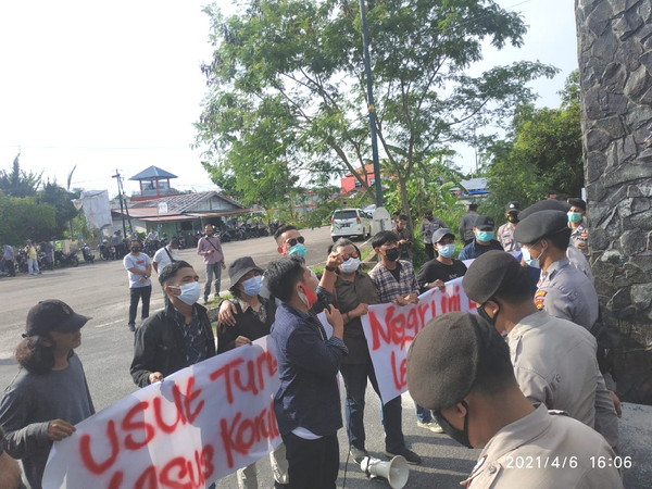 Unjuk rasa damai ini berlangsung di depan kantor Bupati Bengkalis dan berlanjut ke kantor Kejaksaan Negeri Bengkalis, di jalan Pertanian, Selasa (6/4/2021).