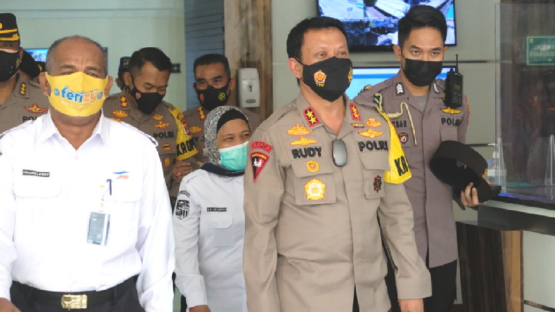 BNEWS - Kapolda Banten Irjen Pol Rudy Heriyanto Adi Nugroho didampingi General Manager PT ASDP Indonesia Ferry Cabang Utama Merak, Hasan Lessy dan Kapolres Cilegon, meninjau Pelabuhan Penyeberangan Merak, Rabu (14/4/2021).