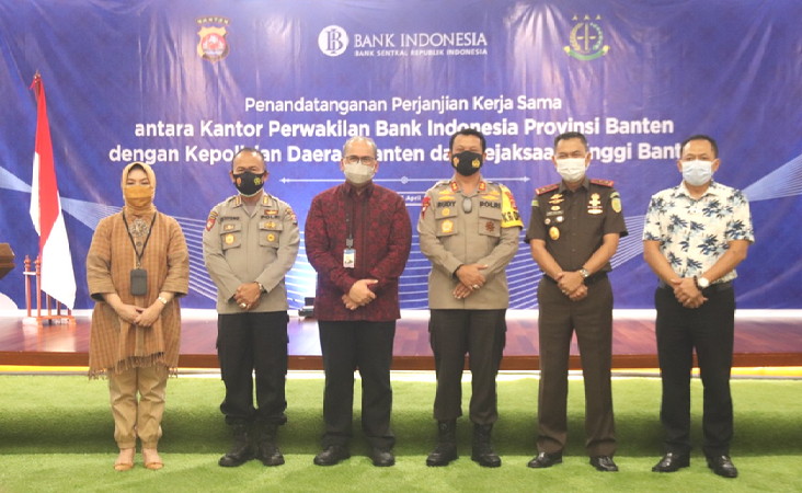 Penandatanganan Perjanjian kerjasama ini dilakukan oleh Kepala Kantor Perwakilan Bank Indonesia (BI) Provinsi Banten Erwin Soeriadimadja, Kapolda Banten Irjen Rudy Heriyanto Adi Nugroho dan Kepala Kejaksaan Tinggi Banten Dr. Asep Nana Mulyana.