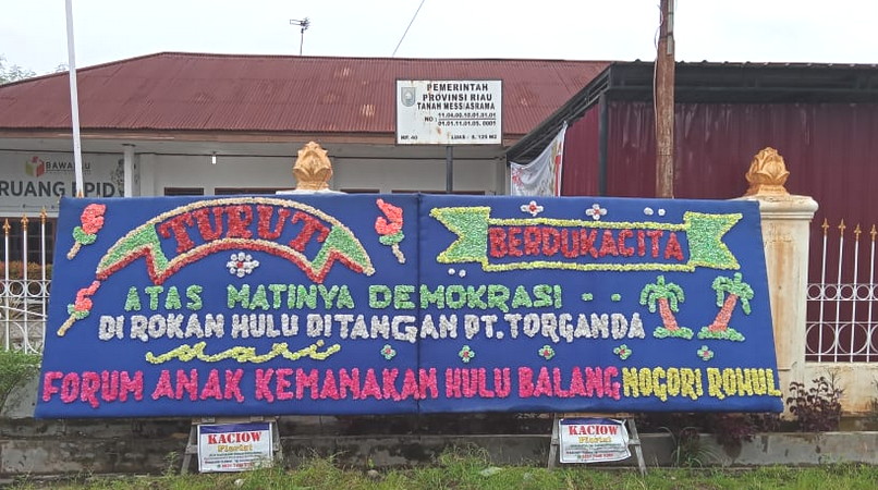 Aliansi Masyarakat Adat Rokan Hulu (AMA Rohul) mengirim karangan bunga ke Bawaslu Riau, dengan tulisan "Ikut Berduka atas Matinya Demokrasi di Tangan PT Torganda Rokan Hulu".