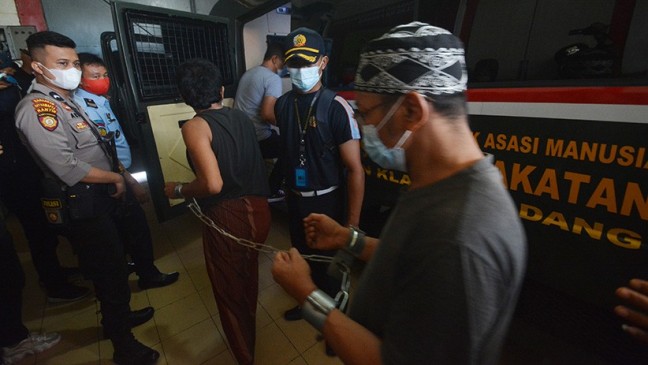 BNEWS - Petugas merantai tangan 8 orang narapidana (napi) Lapas Kelas II A Muaro Padang, Sumatera Barat (Sumbar) saat hendak dimasukkan ke dalam mobil, Sabtu (1/5/2021). Mereka terindikasi berusaha kabur.
