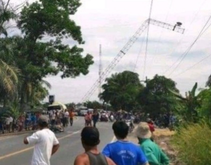 Menurut Kapolsek, kejadian tersebut sekitar pukul 14.00 WIB. Penyebabnya, ada tukang bangunan dari warga setempat sedang menebang pohon sawit, pas roboh kena tiang tower tersebut.