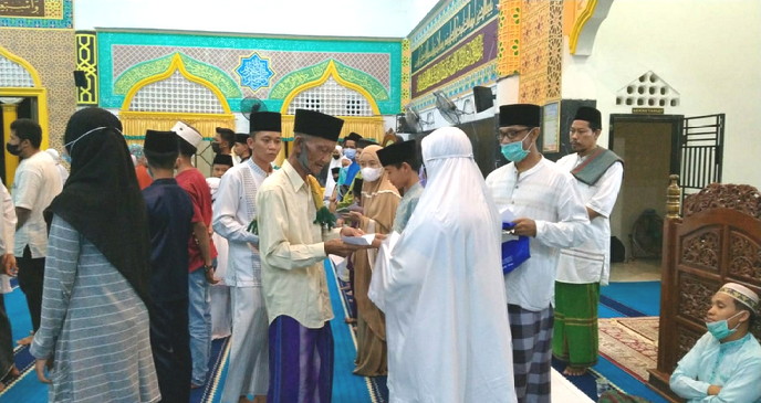 BNEWS - Pengurus Masjid Al-Mubaraq Desa Senggoro, Kecamatan Bengkalis, Kabupaten Bengkalis, Selasa (4/5/2021), memberikan santunan kepada 45 anak yatim.Santunan langsung diserahkan oleh Ketua Masjid Al'Mubaraq, Mohd Syarif, bersama Wakil Ketua Ed Efendi dan pengurus Masjid Al-Mubaraq lainnya.