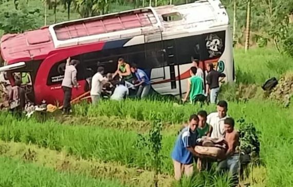 Dua orang meninggal dunia dalam tragedi ini dan puluhan penumpang lainnya luka-luka. Bus dengan nopol BA 7974 SU ini mengalami kecelakaan dan jatuh ke jurang sedalam 15 meter, kemudian terperosok ke sawah.