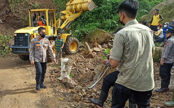 BNEWS - Kapolres Lebak, Banten, AKBP Ade Mulyana, terjun langsung memimpin proses evakuasi material longsor di Jalan Raya Cipanas-Warung Banten, Blok. Citagogag Desa Banjarsari, Kecamatan Lebakgedong Kabupaten Lebak, Minggu (30/5/2021).