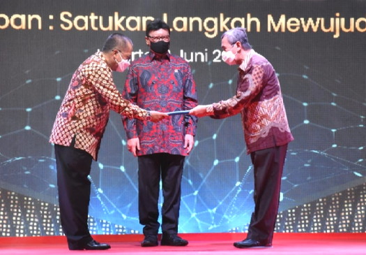BNEWS - Gubernur Riau (Gubri) Syamsuar menyerahkan sertifikat tanah kepada Arsip Nasional Republik Indonesia (ANRI) pada malam puncak peringatan Hari Kearsipan ke-50 Tahun 2021 di Gedung ANRI, Jakarta, Rabu (09/06/2021).