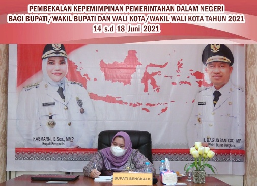 BNEWS - Bupati Bengkalis Kasmarni dan Wakil Bupati (Wabup) Bagus Santoso mengikuti pembekalan kepemimpinan pemerintahan dalam negeri bagi Bupati/Wali Kota dan Wakil Bupati/Wakil Walikota secara virtual bersama Kementerian Dalam Negari, Senin (14/6/2021).