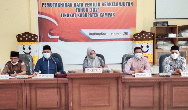 BNEWS - KPU Kampar mensosialisasikan pemutakhiran daftar pemilih berkelanjutan tahun 2021, kepada seluruh jajaran di internal KPU Kampar. Acara dihadiri seluruh Komisioner, sekretaris, kassubag dan staf.