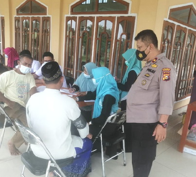 BNEWS - Kapolsek Tapung Kompol Sumarno meninjau pelaksanaan vaksinasi Covid-19 di Mesjid Nurul Huda, Desa Tri Manunggal yang digelar setelah pelaksanaan shalat Jumat (18/6/2021).