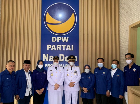 BNEWS - Usai dilantik oleh Gubernur Riau, di Balai Serindit Gedung Daerah Provinsi Riau, Senin (5/7/2021), Bupati dan Wakil Bupati Indragiri Hulu (Inhu), Rezita Meylani Yopi dan Junaidi Rachmat, berkunjung ke Kantor DPW Partai NasDem Riau di Pekanbaru