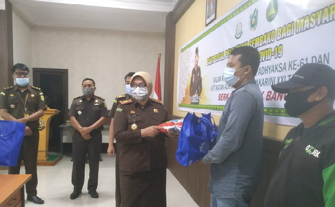 Paket sembako diserahkan oleh Kajari Bengkalis Nanik Kushartanti secara simbolis kepada tukang ojek dan tukang becak. Sebelumnya, Kajari dan jajaran serta bersama anggota IAD mengikuti acara secara virtual dengan Kejaksaan Agung RI.