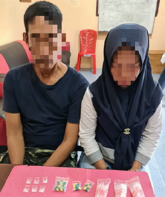 BNEWS - Polsek Siak Hulu menangkap pasangan suami istri (pasutri) pengedar narkotika di Jalan Raya Labersa, Desa Tanah Merah, Kecamatan Siak Hulu, Selasa (13/07/2021).