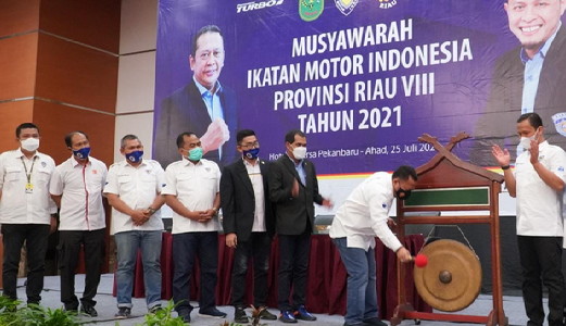 BNEWS - Ikatan Motor Indonesia (IMI) Riau menggelar Musyawarah Provinsi untuk memilih Ketua dan pengurus periode 2021-2025. Acara digelar di Ballroom Labersa Hotel Siak Hulu, Minggu (25/7/2021), yang ditandai dengan pemukulan Gong oleh Bupati Kampar.