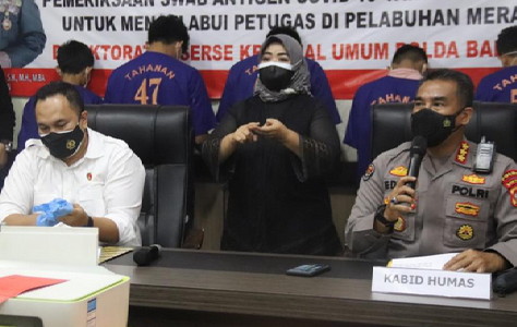 BNEWS - Direktorat Reserse Kriminal Umum (Dirreskrimum) Polda Banten mengungkap kasus sindikat pemalsu surat hasil swab antigen Covid-19 di Kawasan Pelabuhan Merak, Banten.