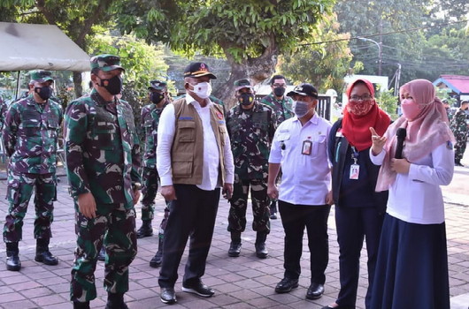 Di sela-sela peninjauannya, Panglima TNI berdialog dengan salah satu dokter puskesmas terkait berapa persen warga yang sudah melakukan vaksinasi.