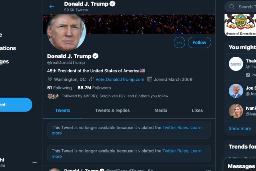 "Setelah meninjau secara cermat Tweet baru-baru ini dari akun @realDonaldTrump dan konteks di sekitarnya, kami telah secara permanen menangguhkan akun tersebut karena risiko hasutan lebih lanjut untuk melakukan kekerasan," tulis Twitter.