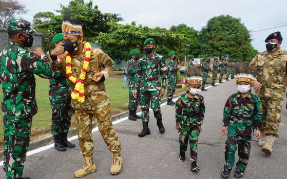 Saat kunjung kerja di Detasemen Zeni Tempur (Denzipur) 11/MA, Komandan PMPP TNI beserta rombongan menerima jajar kehormatan dan disambut dengan tarian adat.