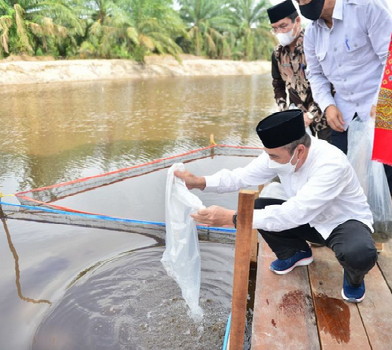 Selain menebar bibit ikan, di kesempatan yang sama Gubri juga meletakkan batu pertama pembangunan Pondok Pesantren Tahfiz Sains Al-Azhar Addauly dan menyerahkan bantuan sembako.