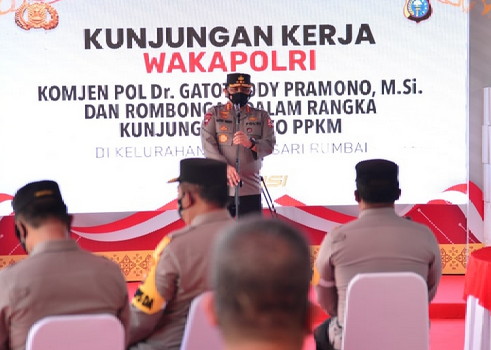 BNEWS - Wakapolri Komjen Pol Gatot Eddy Pramono melakukan kunjungan kerja (Kanker) ke Kota Pekanbaru, Riau. Salah satu kegiatannya melakukan pengecekan vaksinasi massal di Pos PPKM Umban Sari, Kecamatan Rumbai, Selasa (10/8/2021).