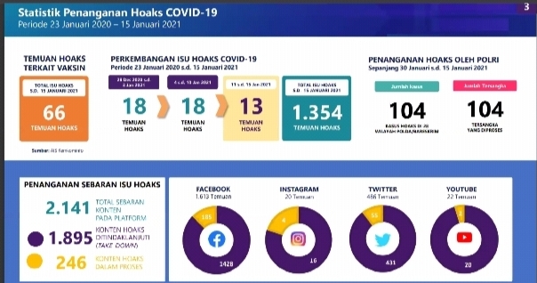 "Sejak 23 Januari 2020 hingga 15 Januari 2021 Kemkominfo telah menemukan 2.141 konten hoaks di media sosial," kata Mira.