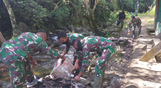 BNEWS - Sebanyak 9 anggota Pos Kotis Satgas Pamrahwan Yonif RK 751/VJS yang dipimpin oleh Pasiter Satgas Letda Inf. A. Sirait, melaksanakan kerja bakti membersihkan sampah di lokasi Wisata Air Terjun Distrik Walesi, Kab. Jayawijaya, Papua, Senin (23/08/2021).