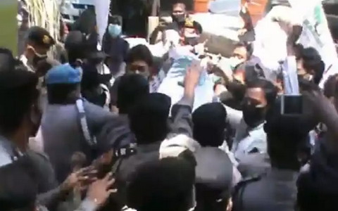 Situasi sempat tak terkendali karena terjadi saling dorong. Para pendemo akhirnya mengangkat kedua tangan sebagai simbol menyerah dan tidak melakukan perlawanan.