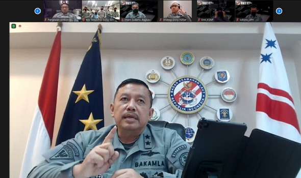 Kepala Badan Keamanan Laut (Bakamla) RI Laksdya TNI Aan Kurnia, diwakili Sekertaris Utama (Sestama) Bakamla RI Laksda TNI S. Irawan, memberikan pengarahan kepada ratusan personel Bakamla RI yang berdinas di Mabes Bakamla RI, Kantor Zona, SPKKL, Stasiun Bumi dan Kapal Negara (KN) secara daring, dari Ruang Kerja Sestama Bakamla RI di Jakarta Pusat, Selasa (31/8/2021).