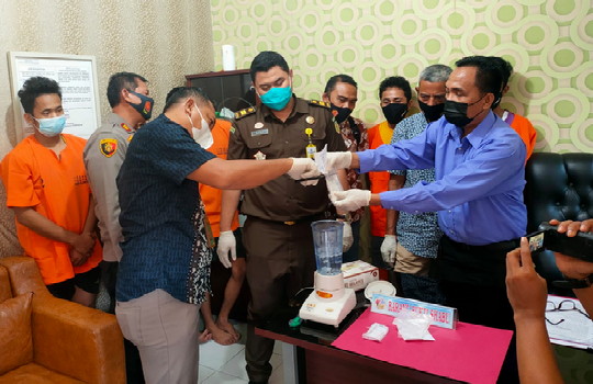Selanjutnya dilakukan pemusnahan 96,21 Gram narkotika jenis shabu tersebut, dengan cara dilarutkan dalam air kemudian diblender lalu dibuang ke tanah.