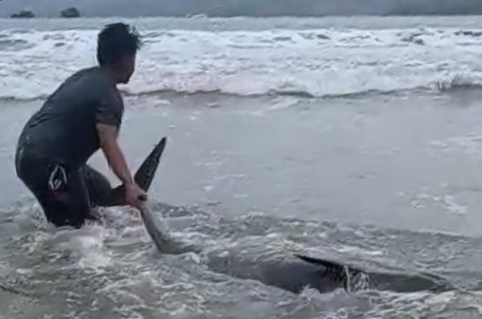 Sementara satu ekor lagi hingga saat ini masih berada di kawasan pantai. Warga telah berulang kali berusaha mendorong lumba-lumba itu ke tengah, namun kembali ke tepi terbawa ombak.
