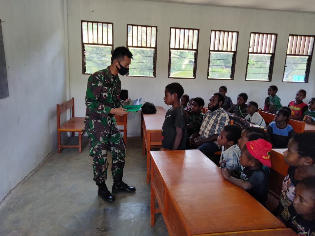 BNEWS - Dalam rangka meningkatkan rasa nasionalisme bagi para pelajar, 7 personel Pos Popome Satgas Pamrahwan Yonif RK 751/VJS yang dipimpin Letda Inf Bintang Cakti Wirasatya kunjungi Sekolah Dasar (SD) Trikora Jayawijaya di Distrik Popome, Kabupaten Lanny Jaya, Papua, Rabu (8/9/2021).