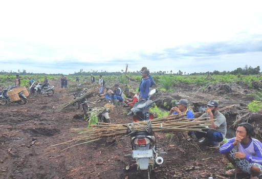 Masyarakat membawa ratusan batang pohon karet untuk ditanami di areal sawit tersebut, karena mereka tidak ingin kampungnya banjir dengan maraknya penanaman sawit yang dilakukan oleh orang di luar desa Sungai Linau.