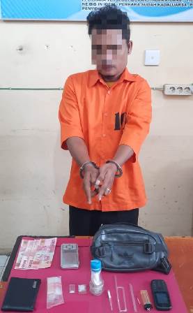 Selanjutnya dilakukan penggeledahan terhadap tersangka dan ditemukan barang bukti 2 paket narkotika jenis shabu terbungkus plastik bening, beberapa peralatan penggunaan shabu dan sejumlah barang bukti lainnya terkait kasus ini.