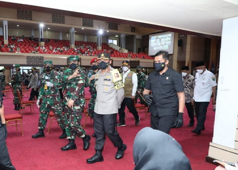 BNEWS - Panglima TNI Marsekal TNI Hadi Tjahjanto, didampingi Kepala BNPB Letjen TNI Ganip Warsito, Kabaharkam Polri Komjen Pol Arief Sulistyanto, dan segenap Pejabat Mabes TNI dan Mabes Polri, meninjau serbuan vaksinasi di Universitas Negeri Padang (UNP), Sumatera Barat, Rabu (22/9/2021).