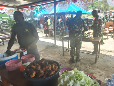 BNEWS - Dalam rangka memeriahkan Hari Ulang Tahun (HUT) ke 76 TNI Tahun 2021, Satgas Pamrahwan Yonif RK 751/VJS yang berada di Distrik Walesi, Kabupaten Jayawijaya, Papua, melaksanakan doa dan makan bersama masyarakat.