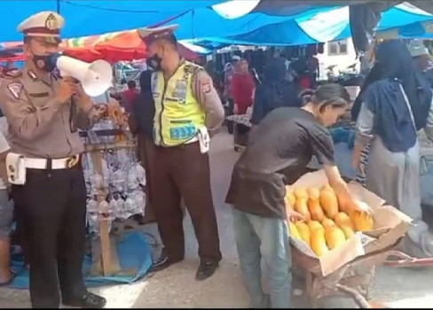 BNEWS - Kasat Lantas Polres Kampar AKP Yulihasman didampingi Kanit Dikyasa Aiptu Junaidi dan beberapa personel Satlantas, memberikan himbauan tentang penerapan protokol kesehatan terhadap para pedagang dan pengunjung Pasar Air Tiris Kecamatan Kampar.