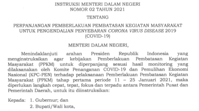 Inmendagri dikeluarkan dalam rangka menindaklanjuti arahan Presiden Jokowi yang menginstruksikan agar kebijakan PPKM diperpanjang, sesuai hasil monitoring yang dilaksanakan oleh Komite Penanganan Covid-19 dan Pemulihan Ekonomi Nasional (KPCPEN) terhadap pelaksanaan PPKM tahap pertama periode 11-25 Januari 2021.