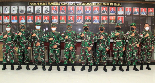 BNEWS - Dalam rangka meningkatkan sinergitas, Pangdam XVII/Cenderawasih Mayjen TNI Ignatius Yogo Triyono, didampingi para pejabat Kodam XVII/Cenderawasih, menerima kunjungan Pangdam IV/Diponegoro Mayjen TNI Rudianto beserta rombongan, di Ruang Cycloops Makodam XVII/Cenderawasih, Senin (25/10/2021).
