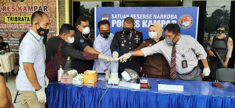 Pemusnahan barang bukti narkotika ini dipimpin Kapolres Kampar AKBP Mohammad Kholid didampingi Kasatres Narkoba AKP Daren Maysar. Ikut hadir Perwakilan Kejaksaan Negeri Kampar Sri Madona Rasdi, Perwakilan Pengadilan Negeri Bangkinang M. Jamal dan Kalakhar BNK Kampar H. Abdul Kadir serta penasehat hukum dan para tersangka yang terkait dengan barang bukti ini.