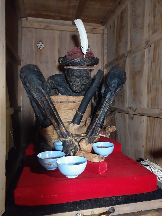 Mumi-mumi di Papua ini posisinya duduk. Alasannya, dalam konsep prasejarah, penguburan dalam posisi duduk ibarat bayi dalam kandungan.